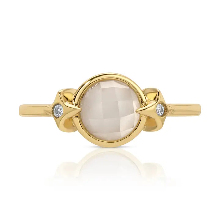 This stunning ring features a faceted round gem, adorned with two delicate stars on each side.
