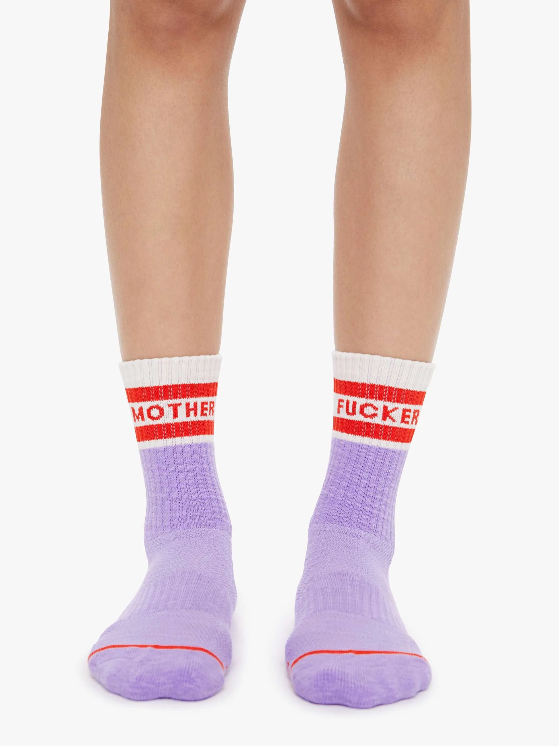 Watch your step. Classic tube socks with a bold message from MOTHER. Shown here in lavender and white with red lettering and details.