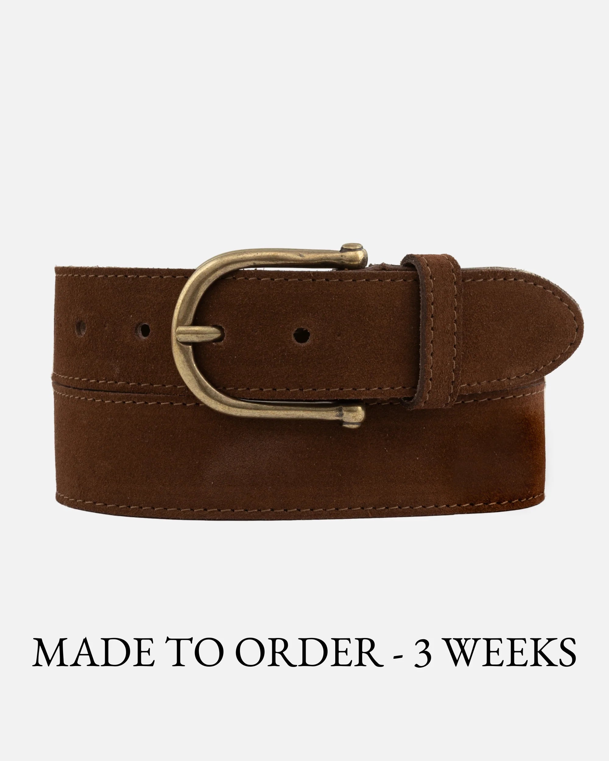 Elevate your wardrobe with the Roan, our vintage-inspired suede leather belt, available in three distinct shades: beige, brown, and green. Crafted from premium Italian leather, this belt seamlessly blends timeless style with durability. The soft suede finish adds a rich texture, while the antique brass buckle exudes rustic charm, making it a versatile accessory for any occasion. Whether you're pairing it with jeans for a casual look or dressing up chinos for a more polished appearance, this belt is designed to age beautifully, developing a unique patina over time. Handcrafted with attention to detail, it offers superior comfort and long-lasting quality. Choose from beige for a neutral, classic touch, brown for a warm, earthy tone, or green for a modern pop of color.