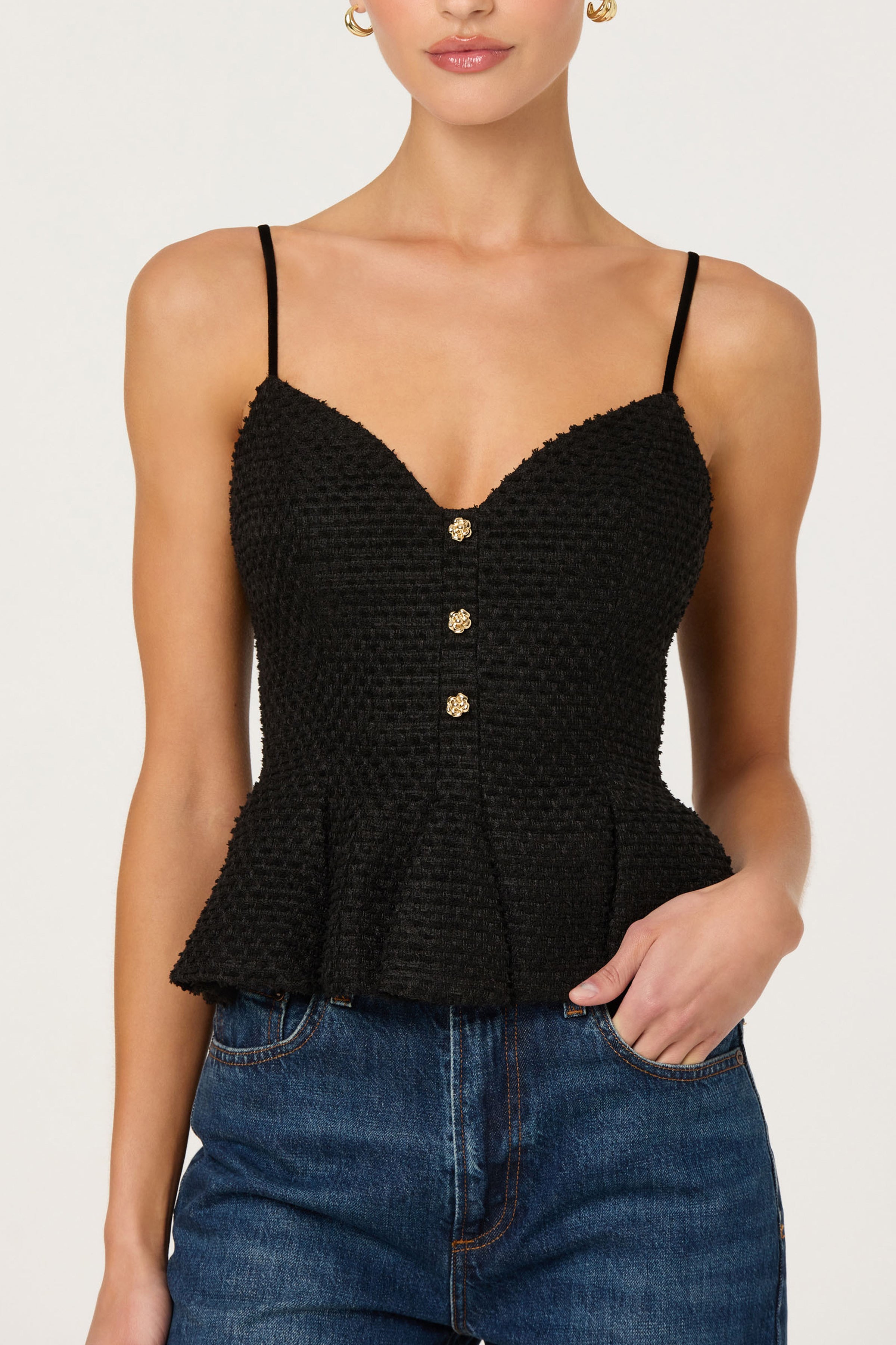Crafted in textured tweed with a sweetheart neckline and slim spaghetti straps, this peplum top is the perfect elevated basic. Style it with jeans for a casual day look or pair it with a skirt for an effortless night-out outfit.