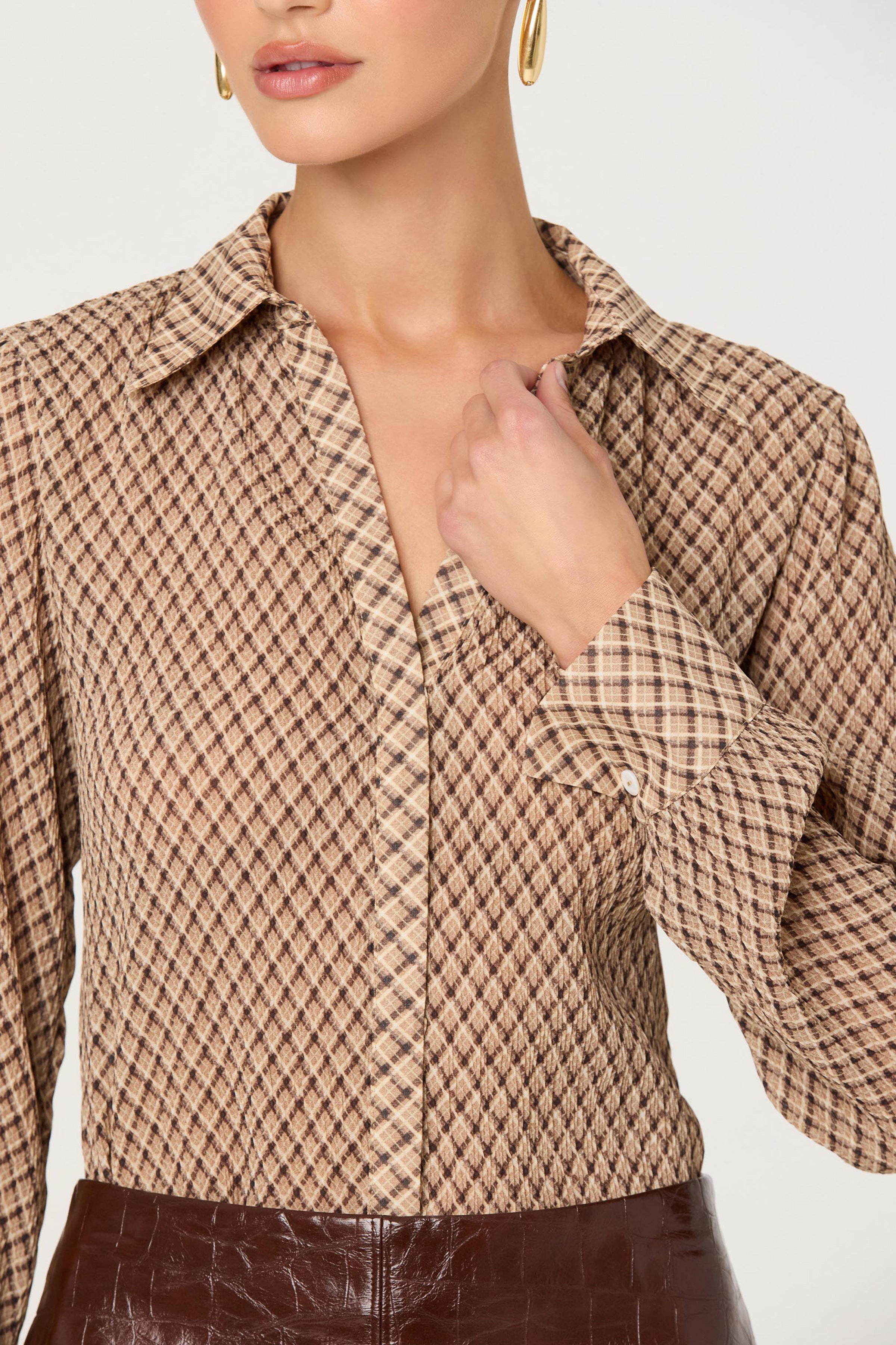 Add polish to your everyday with this easy button-up style shirt that features a retro diamond print. This shirt was made for workdays, weekend outings or your next coffee date.