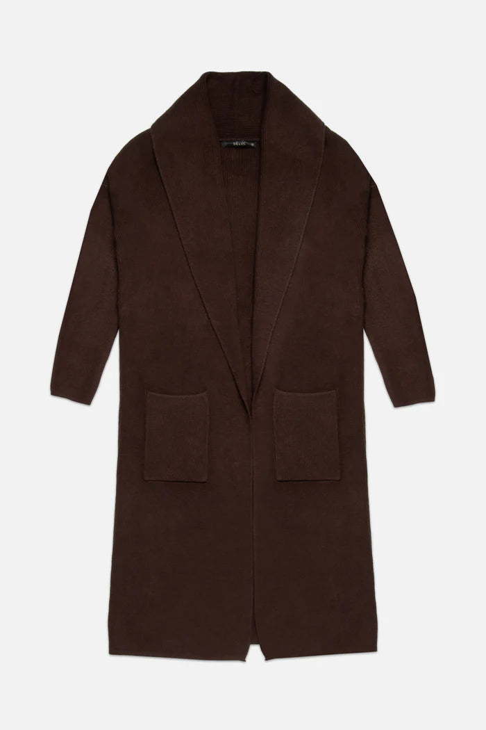 Viscose blend maxi cardigan with shawl lapel collar and long sleeves. Patch pockets on front.