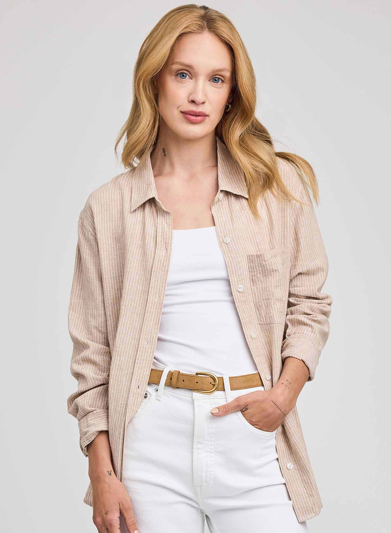 The Dominique button-down is made of a linen blend with a yarn dyed stripe. Features include a patch pocket and side slits.